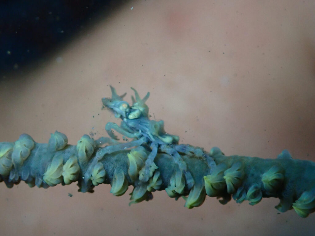 海中では、しっかり目を凝らさないと気づけないほど見事に擬態したムチカラマツエビ、