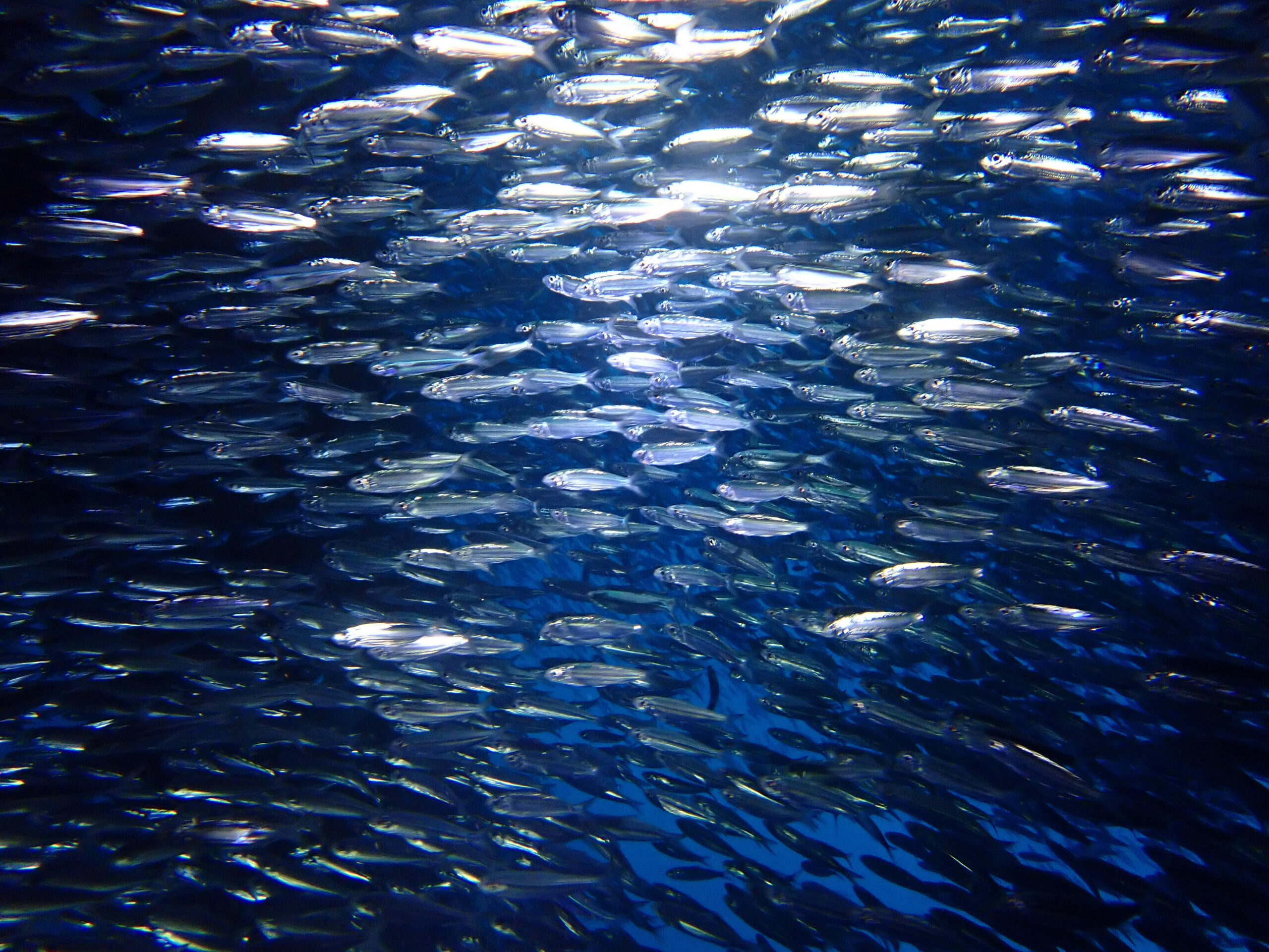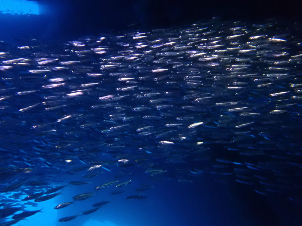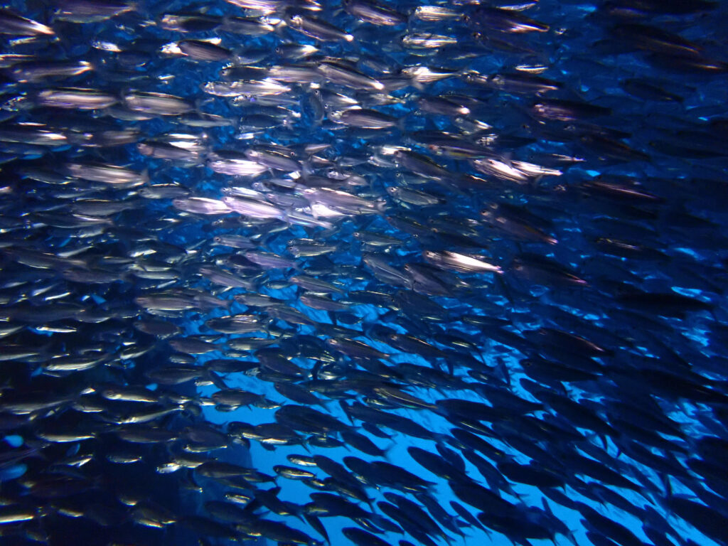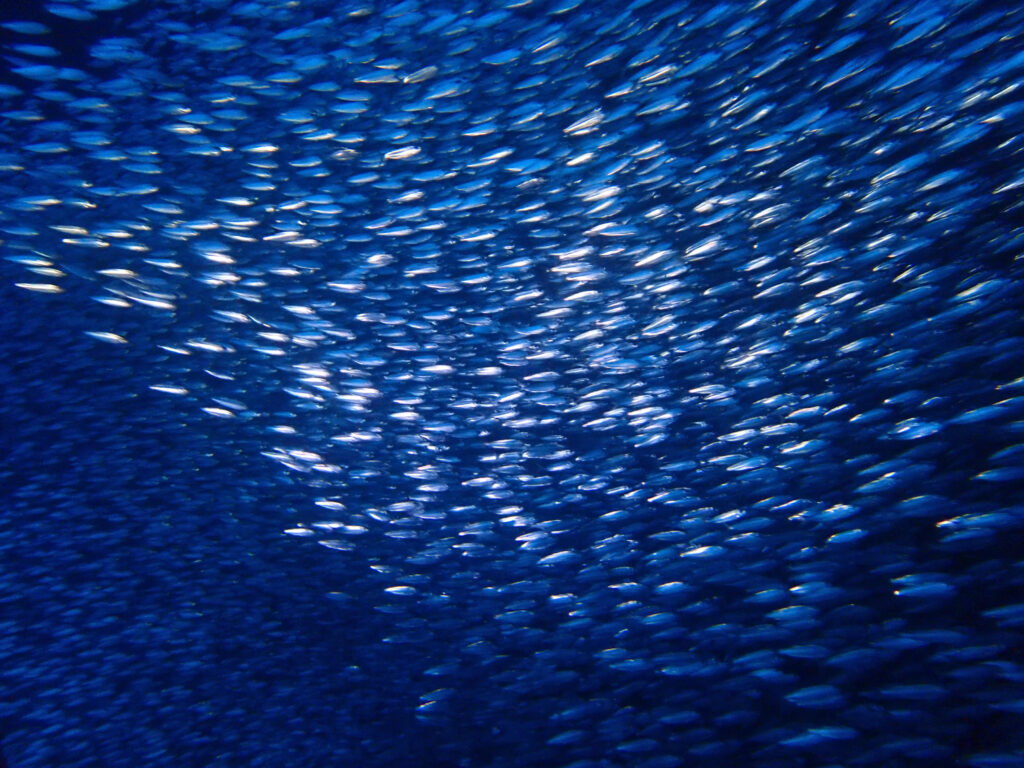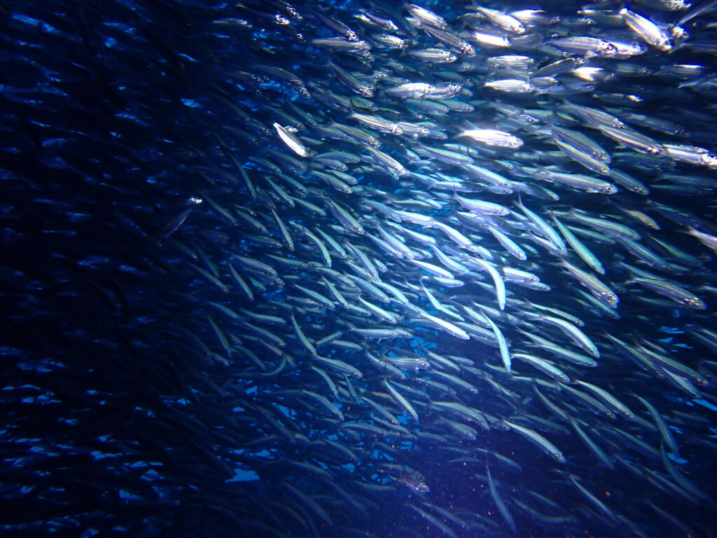 浅場で太陽が沈んでいく光の中、ミジュン(イワシ)の超巨大な魚群。